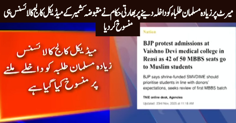 Indian authorities revoked the license of a medical college in occupied Kashmir for admitting too many Muslim students