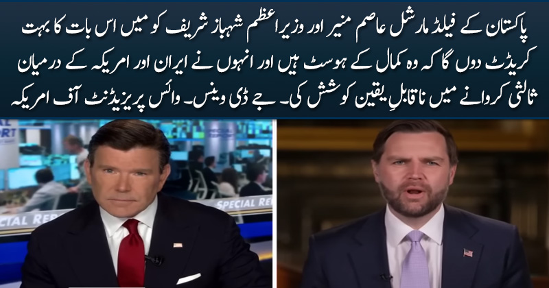 پاکستان کے فیلڈ مارشل عاصم منیر اور وزیراعظم شہباز شریف کو میں اس بات کا بہت کریڈٹ دوں گا کہ وہ کمال کے ہوسٹ ہیں اور انہوں نے ایران اور امریکہ کے درمیان ثالثی کروانے میں ناقابلِ یقین کوشش کی۔ جے ڈی وینس۔ وائس پریزیڈنٹ آف امریکہ